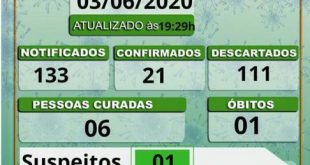 Divulgado um novo Boletim atualizado pela Secretaria Municipal de Saúde de Valença do Piauí mostra que no município há 21 casos confirmados, 1 óbito, 1 suspeito, 6 pessoas curadas, 27 monitoramentos, 111 descartados 133 notificações da COVID 19, o novo cororonavirus. A Prefeita Ceiça Dias afirma que junto com sua equipe continua ...